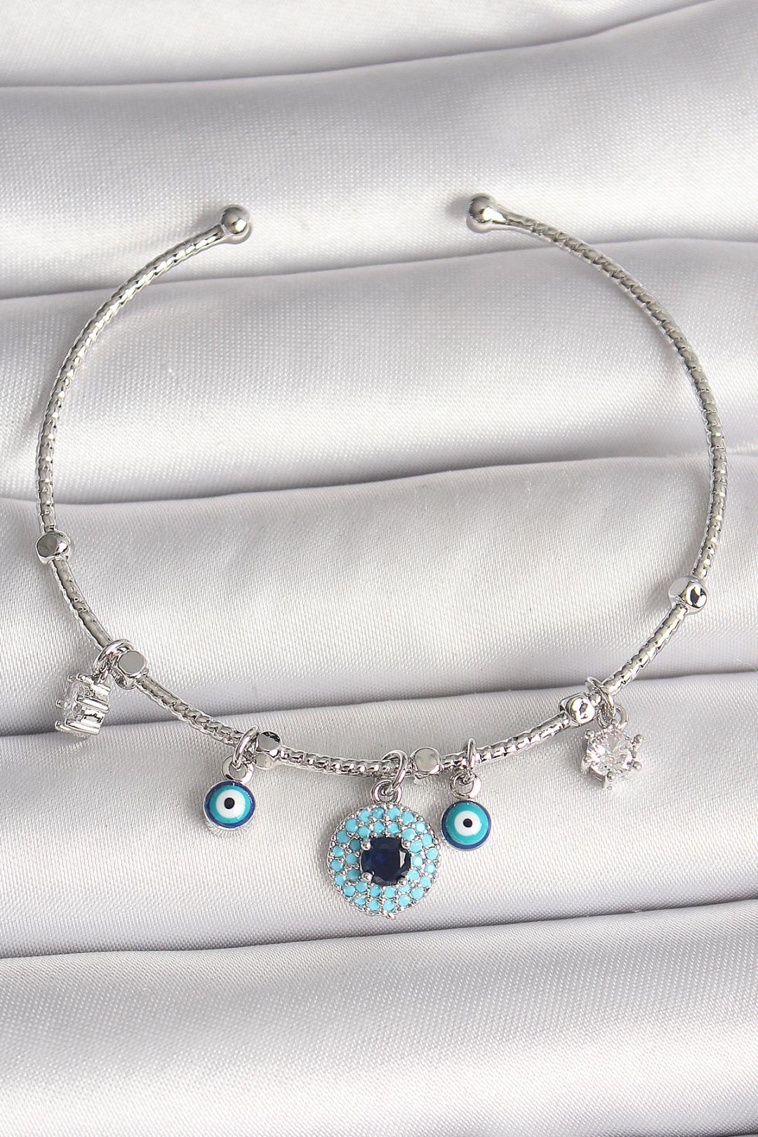 Silver Color Women’s Bracelet with Dangling Zircon Stone Evil Eye Figure Charm, Made of Brass $95.00
